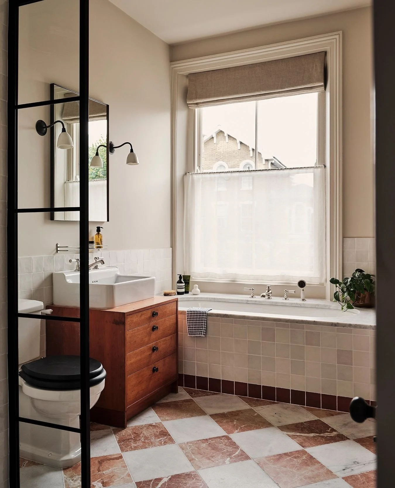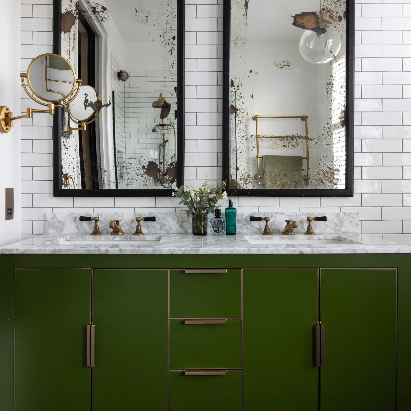 An attic bathroom with a rooftop view, featuring our all-metal Classic Star handles.