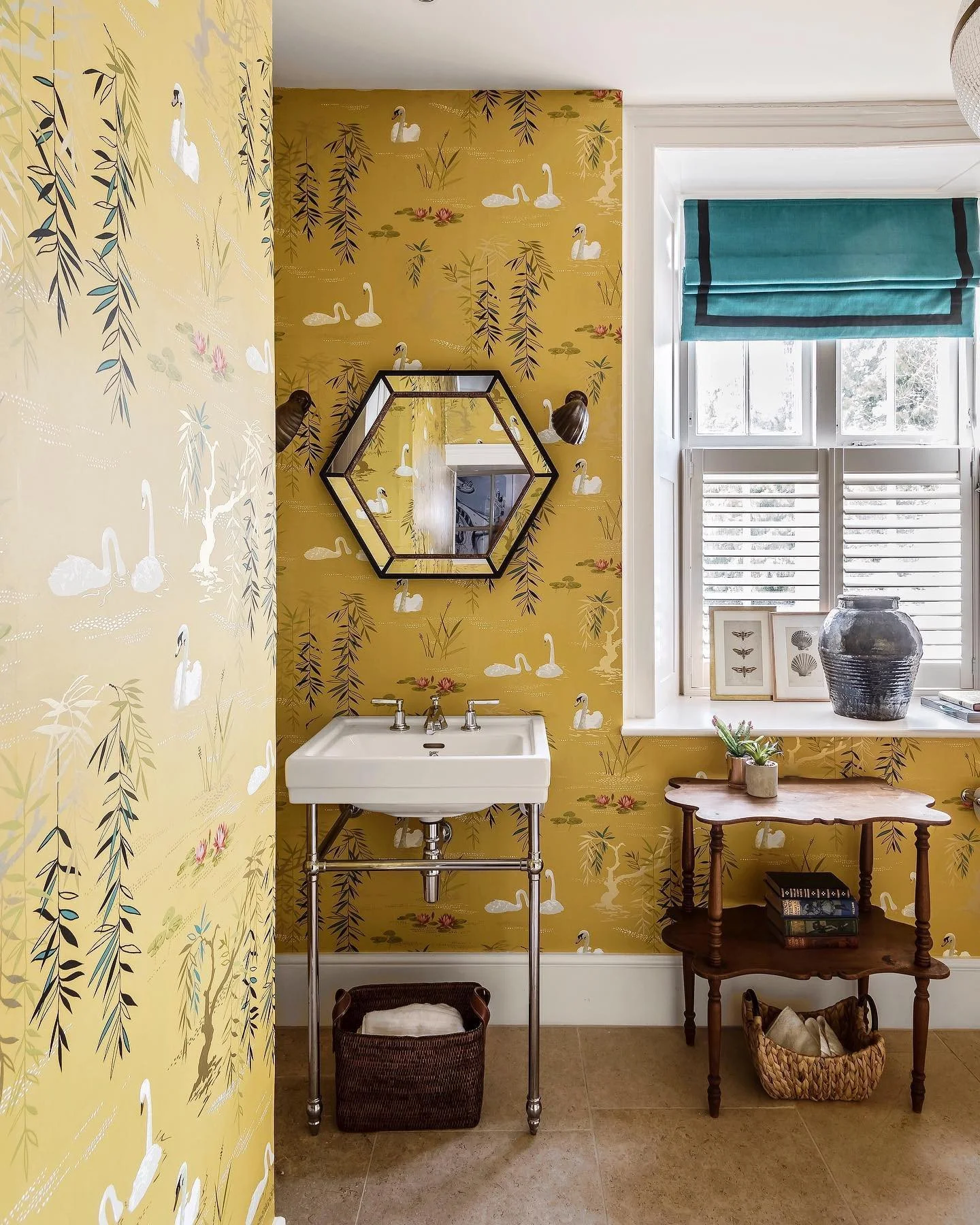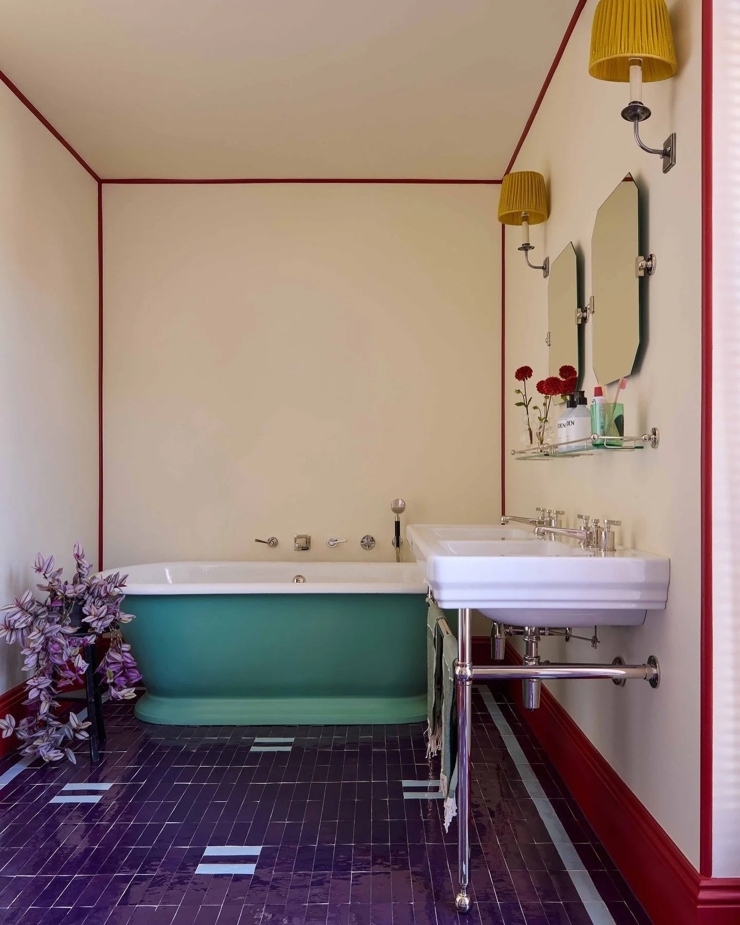 Angular Art Deco design with faceted spouts and black accents. Featuring our Mackintosh double black Marquina marble console flanked by our torch wall lamps.